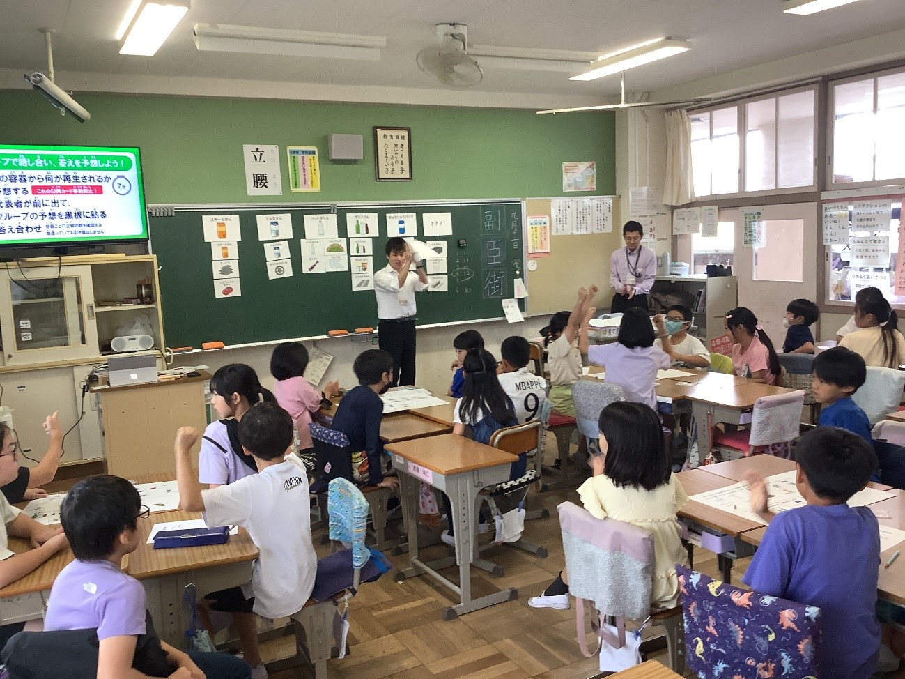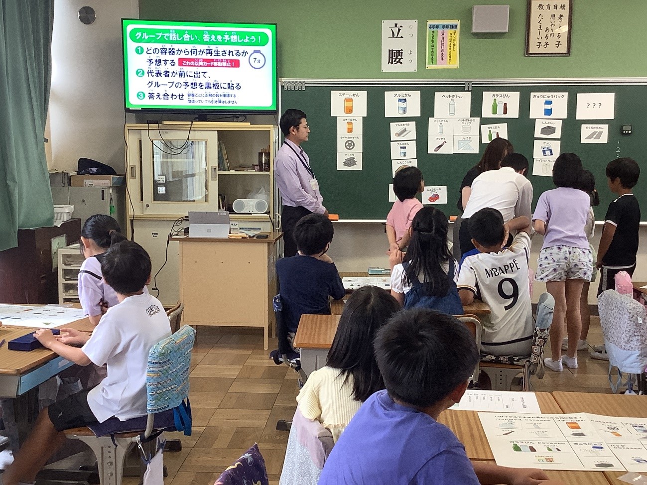 2学期の総合的な学習の時間のテーマは「環境」です。身近な環境問題に目を向けるため、企業の方をゲストティーチャーにお招きして学習を行っています。今日、お世話になったのは、容器を作っている「東洋製罐グループ」の皆さんです。リサイクルされた容器がどんな物に生まれ変わるのか、グループでクイズに取り組みました。「普段、走り回っている人工芝が、まさかペットボトルからリサイクルされていたなんて!!」と、自信満々だったグループも、意外な結果に驚きの声が上がりました。分別への意欲も高まったようです。